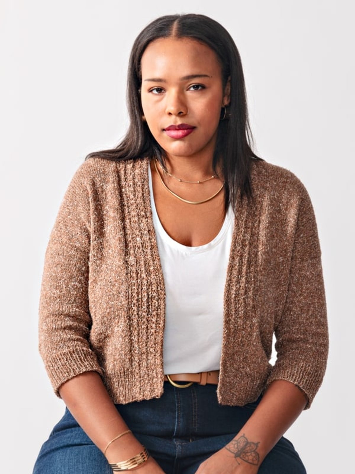 included in all knitting. Instructions are for a cropped version and a long version.