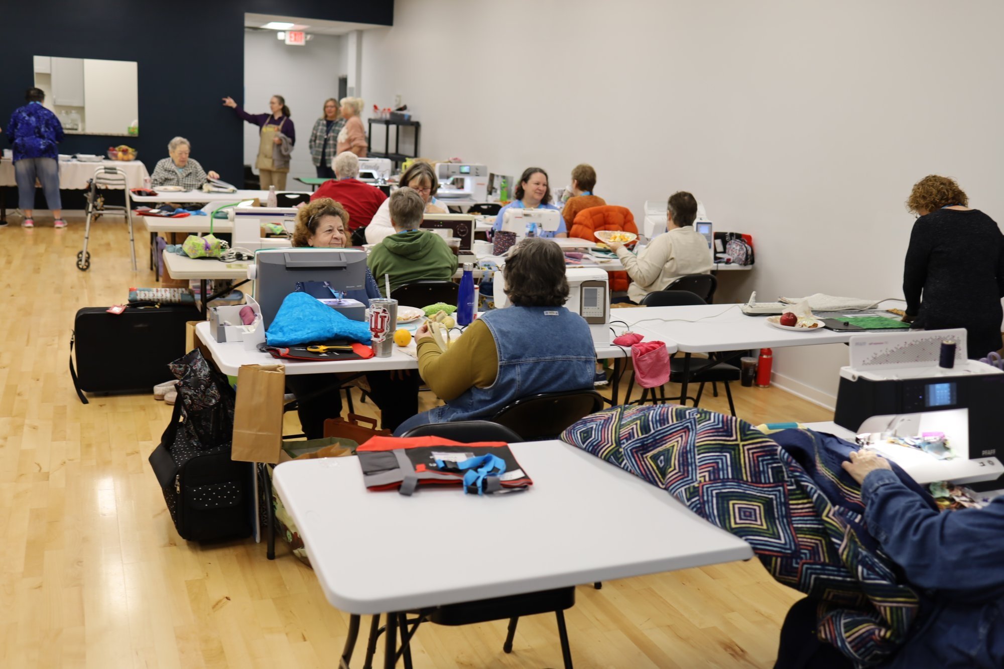 We will have rectangular long tables set up for two people to share. Feel free to bring your own lights, machines and all tools, but please do not bring irons for your personal use. We will have an ironing and cutting station available.